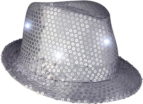 This Shiny Fedora Hat with Flashing Lights is hot hot hot! Wear this super stylish light up hat at any event! The LEDs reflect off the sequins for an awesome light show. Lit fedoras look great at parties, night time event, out on the town- wherever! To activate the LEDs press the button located on the battery pack inside the light up fedora. Set the sequin hat on a random light flash, blink or steady light. One size fits most - Up to 22 inches. Lighted Fedora Hats come ready to use with 2 replaceable CR2032 Batteries.